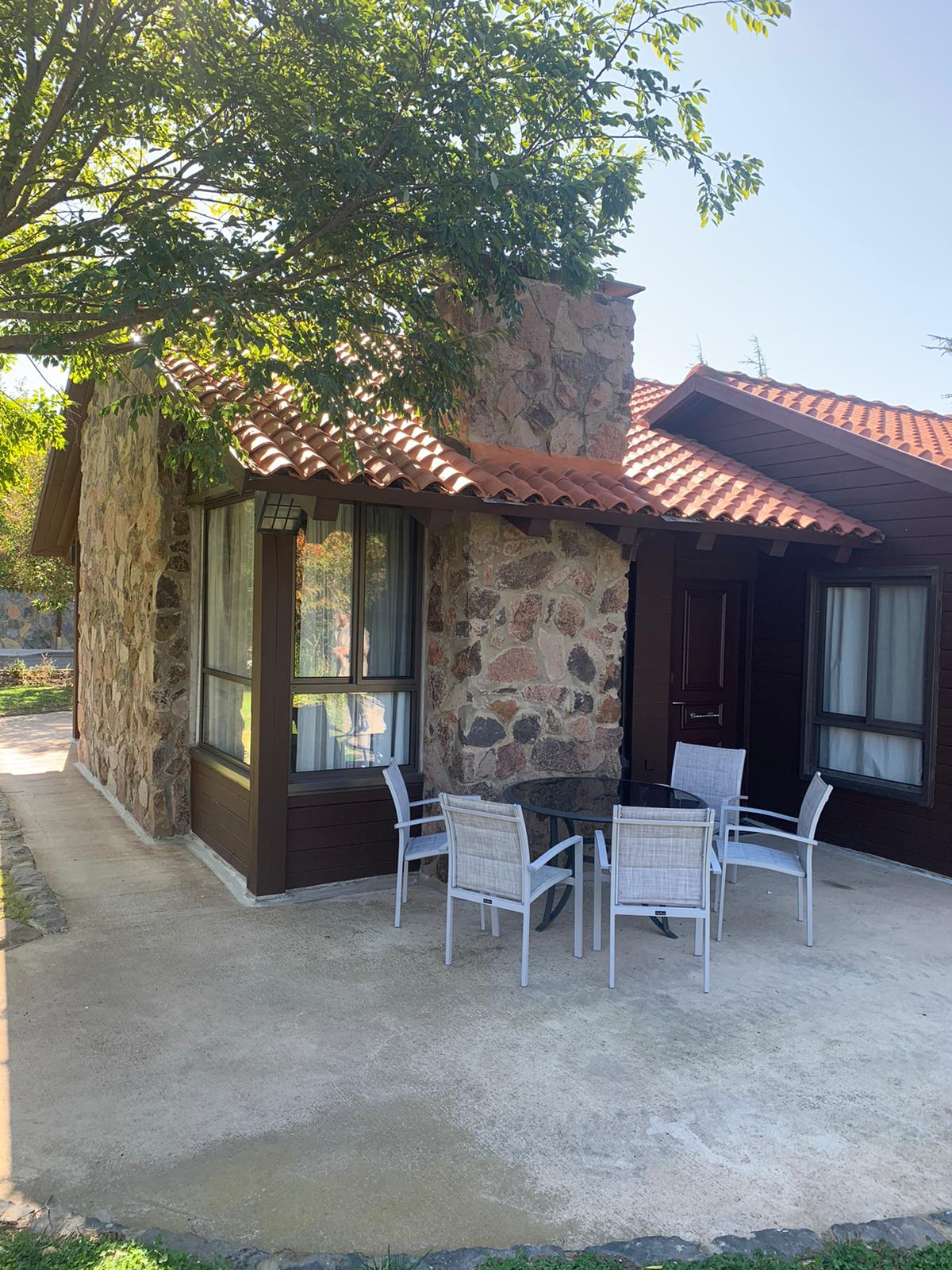 לינה בבקתות מרום גולן, משולבות אבן בזלת ועץ, צמודות קרקע, ומחולקות לחדר שינה וסלון.